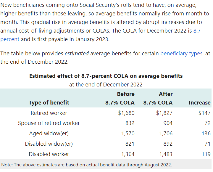 アメリカでは昨今のインフレ事情に合わせて2023年から年金額を引き上げた。これをcost-of-living adjustment (COLA)と言う。引き上げ率は8.7%になる。
