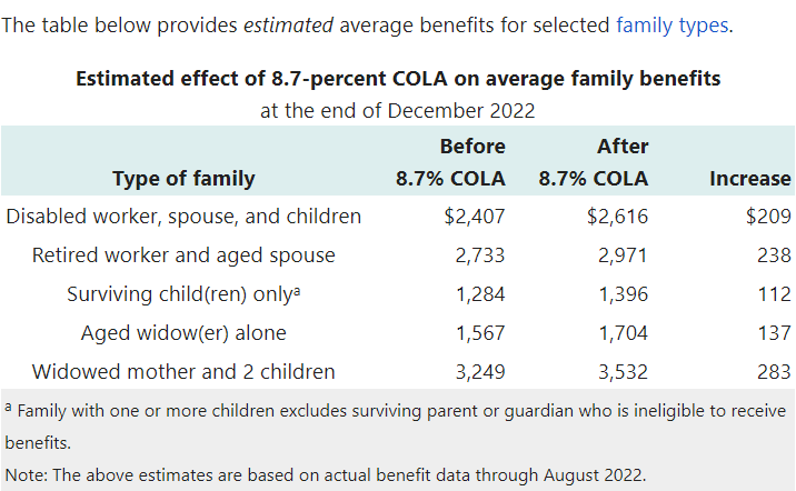 次の表はカップルの2022年の満期のリタイアのCOLA前とCOLA後の平均年金額だ。これによると月平均が2,733ドルから8.7%引き上げられて2,971ドルになる。これを1ドル130円換算にすれば38万6230円となる。