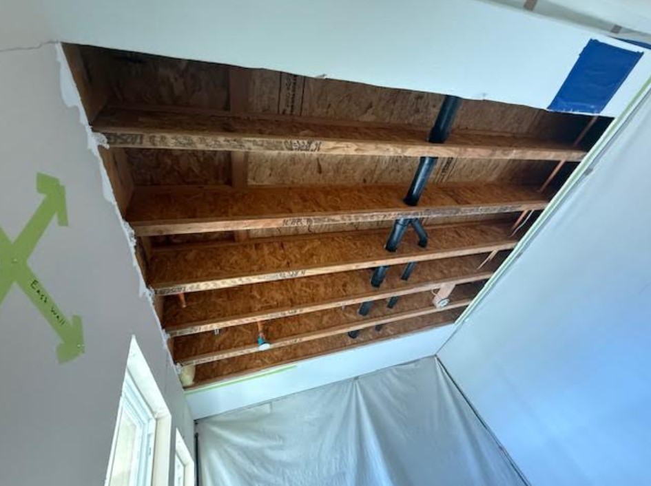 お陰で一階は天井の半分を剥がし外側の内壁も半分剥がしてドライヤーで中の木材を乾かしている。